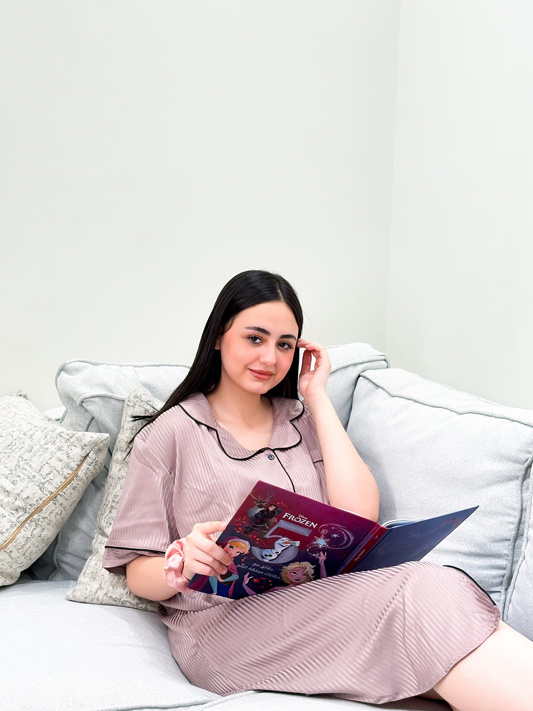 A delicately striped satin night shirt in soothing cashmere-inspired tones, designed to bring quiet elegance to your lounging. Its silky touch glides over the skin, while the relaxed fit makes it perfect for slow mornings, peaceful nights, or whenever you need a moment of calm indulgence. One size fits most, flowing effortlessly to flatter every shape.